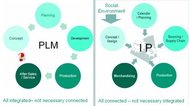 The right image is how I understood the conceptual PLM environment for apparel (and probably for all industries). Here, the focus is on collaboration in real-time between all disciplines. Data sharing is essential for apparel due to their extreme short go-to-market time (3 to 4 seasons per years – hundreds of SKU to be handled per line/brand). The sequential/departmental approach would be killing their business. And as reacting on trends and consumer moods is so crucial, the social environment needs to be part of the process. Without social connectivity again the brand would probably lose their customers.
