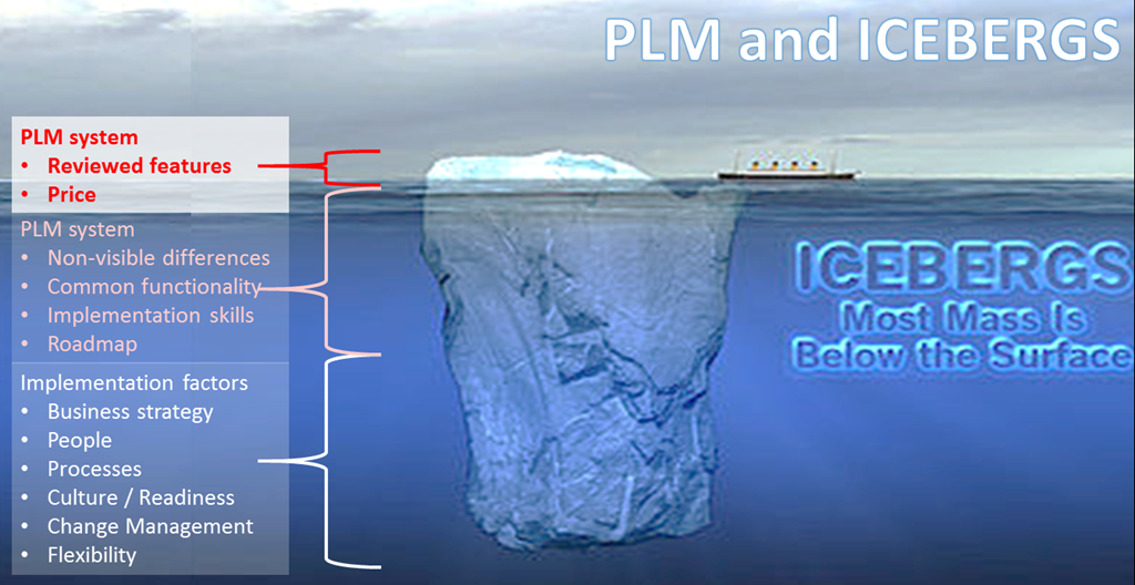 Selecting the right PLM system is just the top of the iceberg. Most PLM systems have lots of functionalities in common. Therefore, when selecting a PLM system, take into account the topics below the waterline. The deeper you get, the more important they are for a successful PLM implementation.