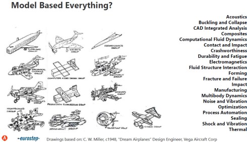 The last formal presentation for day one was from Nigel Shaw from Eurostep Ltd where he took us through the journey of challenges for a model-based enterprise. As there will not be a single model that defines all, it will be clear various models and derived models will exist for a product/system. Interesting was Nigel’s slide showing the multiple models disciplines can have from an airplane (1948). Similar to the famous “swing” cartoon, used to illustrate that every single view can be entirely different from the purpose of the product.