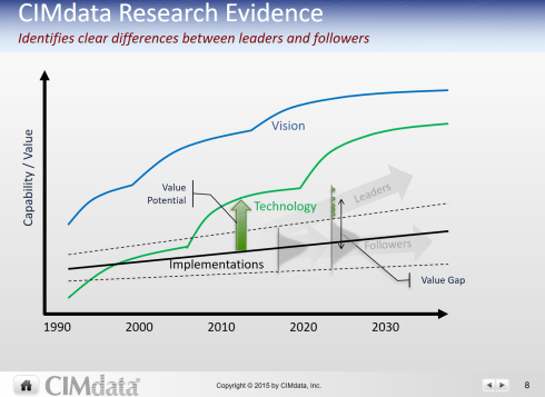 With “we” I do not mean the consulting people. In general, the management of companies is more conservative than consultants are. It is our human brain that is change averse and pushes people to stay in a kind of mainstream mode. In that context, the McKinsey article: How biases, politics, and egos derail business decisions is a fascinating read about company dynamics. Also, CIMdata published in the past a slide illustrating the gap between vision, real capabilities and where companies really are aiming at.