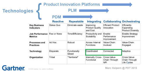 - From Coordinated to Connected, based on the famous diagram from Marc Halpern (image below). The coordinated approach based on documents (files) requires a particular timing (processes) and context (Bills of Information) – it is the traditional and current PLM approach for most companies. On the other hand, the Connected approach is based on connected datasets (here, we talk about data – not files). These connected datasets are available in different contexts, in real-time, to be used by all kinds of applications, particularly modeling applications. Read about it in the series: The road to model-based and connected PLM.