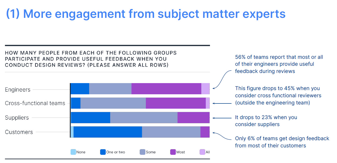 It is known that late-stage design errors are very costly, both impacting product launches and profitability. The report shows design review quality has been rated as the #1 most important factor affecting an engineering team’s ability to deliver projects on time.