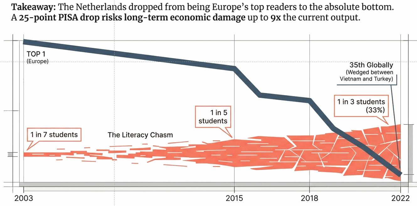 The conclusion: We are in a free fall in the Netherlands (image below) and likely in other countries too, because we are reading less, writing less, and consequently thinking less deeply.