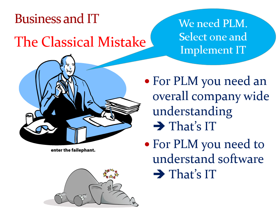 The biggest obstacle I have discovered is that people relate PLM to a system or, even worse, to an engineering tool. This 20-year-old misunderstanding probably comes from the fact that in the past, implementing PLM was more an IT activity – providing the best support for engineers and their data – than a business-driven set of capabilities needed to support the product lifecycle.