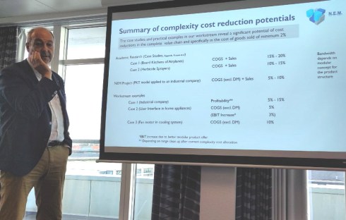 Peter Greiner, NEM member, presented the details of this result during the conference on day 2. The conclusion of the workstream team was a preliminary estimate suggesting a minimum cost reduction of 2-5% in terms of the Cost Of Goods Sold (COGS) on top of traditional modularization savings. These estimates are based on real-world cases.