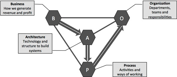 BAPO stands for Business, Architecture, Process and Organization. As the diagram below indicates, you should start from the business, defining the needs for the architecture and then the preferred ways of working. Finally, the organization has to be established in accordance with the processes.