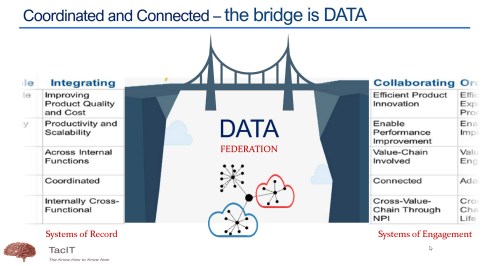 First, I want to point to an example that we presented in the Federated PLM interest group on LinkedIn. Although the discussion initially focused on technical capabilities, we concluded by connecting them to business transformational needs. The diagram below is our characteristic image used to explain the interaction between Systems of Record (the vertical pillars) and the Systems of Engagement (the horizontal bars – modularity).