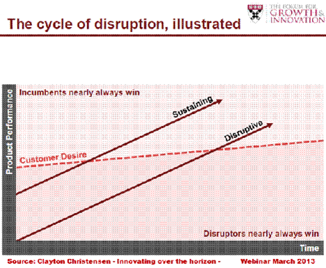 Disruption comes from other technologies and products. In the beginning, they are not even considered by companies in that product space as a possible solution. As these products improve in time at a certain moment, they reach that level of functionality and performance, a potential customer can use these products to address their demands.
