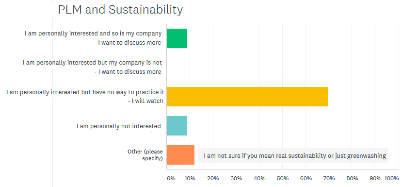 In my early 2021 survey asked participants their viewpoint on PLM and Sustainability. As you can see from the scores, the majority of us are currently observing what is happening.