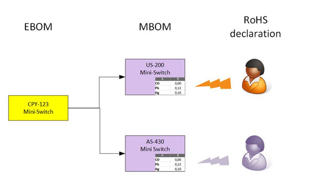 Consumers buying RoHS-compliant products now can be assured that none of the threshold values of the substances is reached in the product. The challenge for the manufacturer is to go through each of the components of the MBOM. To understand if it contains one of the ten restricted substances and, if yes, in which quantity.