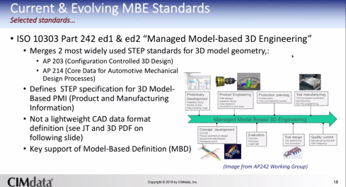 The two major standards for model-based definition are 3DPDF and AP242/JT based. Don’t expect these standards to be complete. They will give you a good foundation for your model-based journey and make sure you are part of this journey. (Listen to the CIMdata webinar also listed below)