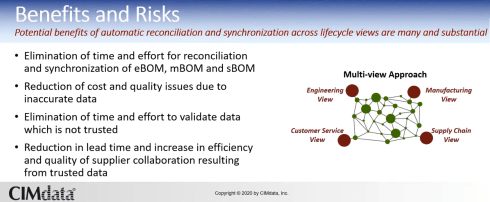 The topic on LinkedIn here initiated an interesting sharing of viewpoints. I am quite aligned with Martin Eigner’s comment. It is a pity that this type of discussion is hidden in a LinkedIn environment and in the German language. It would be great to discuss such a topic at a PLM conference. For example, the CIMdata PLM roadmap conference had several Multiview BOM discussions coming from Aerospace and Defense action groups.