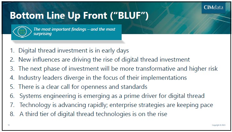 I agree with that statement as the digital thread is like MBD, another steppingstone to organize information in a connected manner, even beyond the scope of engineering-manufacturing interaction. However, Digital Thread is an intermediate step toward a full data-driven and model-based enterprise.