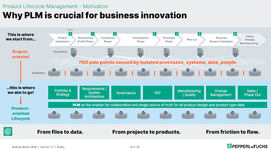 or companies struggling with their digital transformation in the PLM domain, Andreas Wank, Head of Smart Innovation at Pepperl+Fuchs SE, shared his journey so far. All the essential aspects of such a transformation were mentioned. Pepperl+Fuchs has a portfolio of approximately 15,000 products that combine hardware and software.