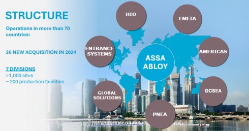 To understand their story, it is essential to comprehend Assa Abloy as a special company, as the image below explains. With over 1000 sites, 200 production facilities, and, last year, on average every two weeks, a new acquisition, it is hard to standardize the company, driven by a corporate organization.