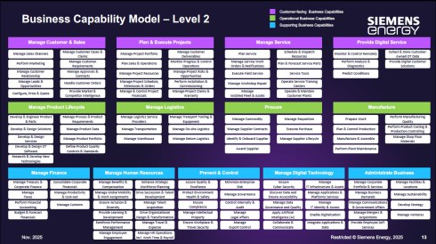 The detailed image above is worth studying if you are interested in the levels and the mappings of the capabilities. The BCM approach was beneficial when the company became disconnected from Siemens AG, enabling it to rationalize its application portfolio.
