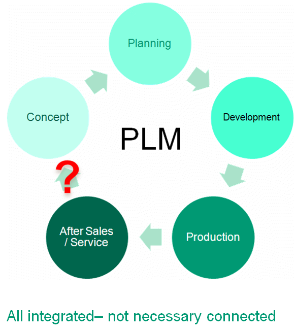 The PLM picture shows the ideal 2006 picture, how each department forwards information to the next department. But where is PLM supporting after sales/services in 2006 ? And the connection between After Sales/Services and Concept is in most of the companies not formalized or existing. And exactly that connection should give the feedback from the market, from the field to deliver better products.
