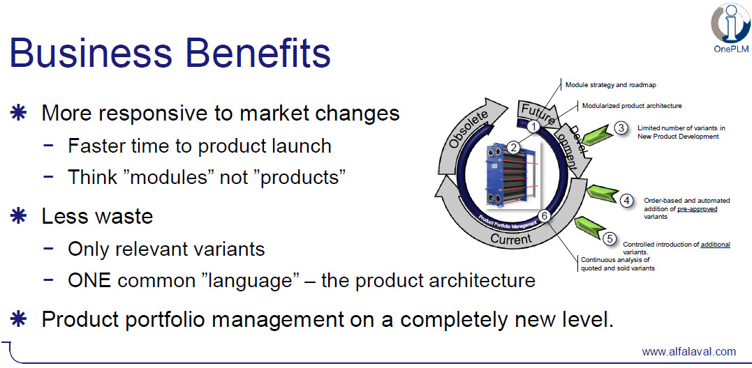 Björn, Alfa Lavalâs OnePLM Programme Director, explained in detail the strategy they implemented to address these challenges. His presentation was very educational and could serve as a lesson for many of us related to product portfolio management and modularization.