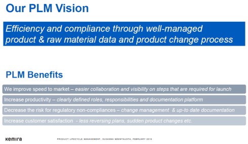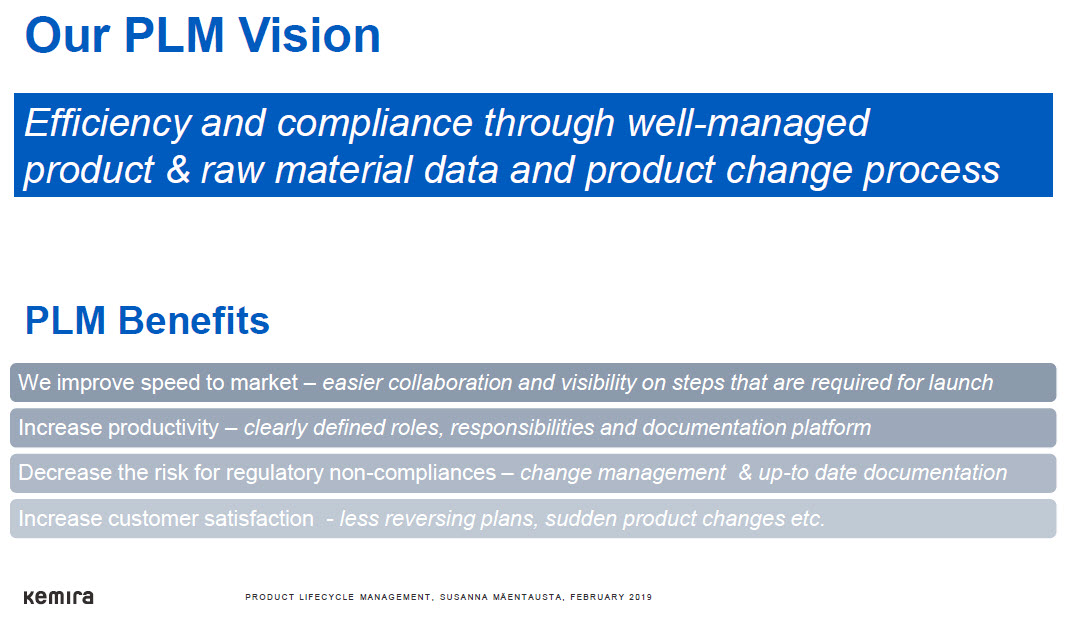 Another interesting session was from Susanna MĂ€entausta  (Kemira oy)  with the title: âIncreased speed to market, decreased risk of non-compliance through integrated PLM in Chemical industry.â I selected her session as from my past involvement with the process industry, I noticed that PLM adoption is very low in the process industry. Understanding Why and How they implemented PLM was interesting for me. Her PLM vision slide says it all: