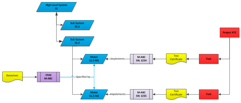 The example below demonstrates the situation where two motors (same item – same datasheet) is implemented at two positions in a subsystem with a different tag number, a unique serial number and unique test certificates per motor.