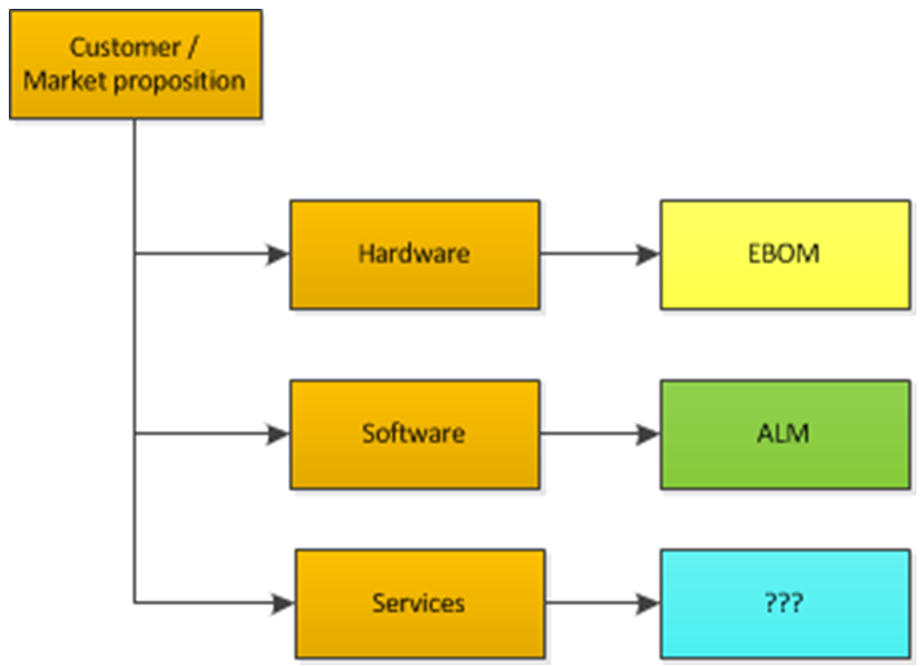 In several companies, original in the Engineering, Procurement & Construction industry, I have seen the need to manage services in the context of the customer delivery too. Highly customized systems and/or disconnected systems were used here. I believe the domain of managing a proposition, a combination of hardware, software, AND services in a connected environment is still in its early days. Therefore the question marks in the diagram.