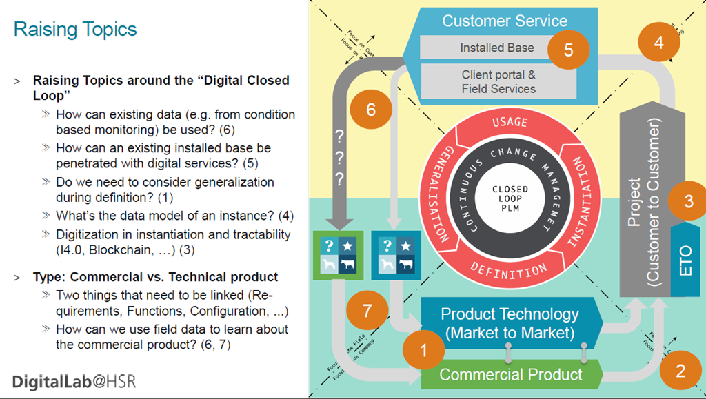 The last extended PLM presentation from day 1 was given by Felix Nyffenegger, professor for PLM/CAx at HSR (University of Applied Science in Rapperswil (CH)). Felix shared his discovery journey into Industry 4.0, and IoT combined with experiences from the digitalLab@HSR, leading into the concept of closed-loop PLM.