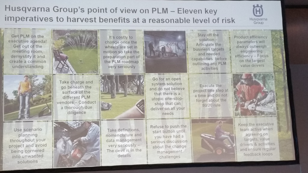 Björn Axling gave an excellent presentation describing the PLM perspective from the Husqvarna group. He addressed the external and internal challenges and opportunities for the group in a structured and logical approach which probably apply for most manufacturing companies in a global market. Björn explained that in the Husqvarna group PLM is considered as a business approach, more than ever, Product Lifecycle Management needs to be viewed as the DNA of a company which was the title of one of his slides.