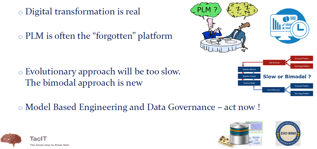 For me, it was interesting to see that also Martin picked up on the bimodal approach for PLM, required to support a transition to a modern digital enterprise (see picture). We cannot continue to build upon our old PLM environments to support, future digital businesses.