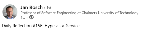 The title of this post is chosen influenced by one of Jan Bosch’s daily reflections # 156: Hype-as-a-Service. You can read his full reflection here.