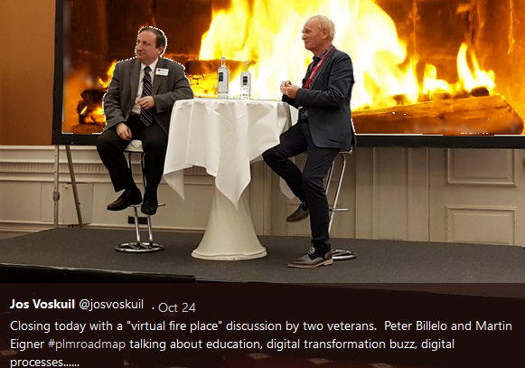 The day ended with a virtual Fire Place session between Peter Bilello and Martin Eigner, the audience did not see a fireplace however my augmented twitter feed did it for me: