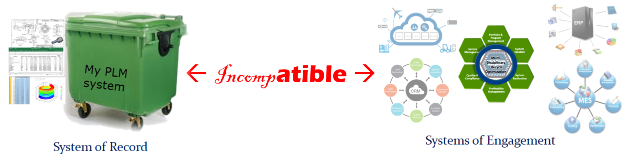 The top image of this post illustrates the current PLM world on the left, and on the right, the potential future positioning of PLM in a digital enterprise. How the right side will behave is still vague – it can be a collection of platforms or a vast collection of small services, all contributing to the performance of the company. Some vendors might dream all these capabilities are defined in one system of systems, like the human body; all functions are available and connected.