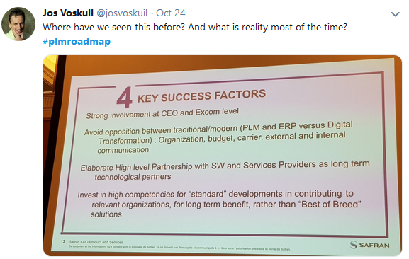 Daniel Dubreuil, Safran’s CDO for Products and Services gave an entertaining lecture related to Safran’s PLM journey and the introduction of new digital capabilities, moving from an inward PLM system towards a digital infrastructure supporting internal (model-based systems engineering / multiple BOMs) and external collaboration with their customers and suppliers introducing new business capabilities. Daniel gave a very precise walk-through with examples from the real world. The concluding slide: KEY SUCCESS FACTORS was a slide that we have seen so many times at PLM events.