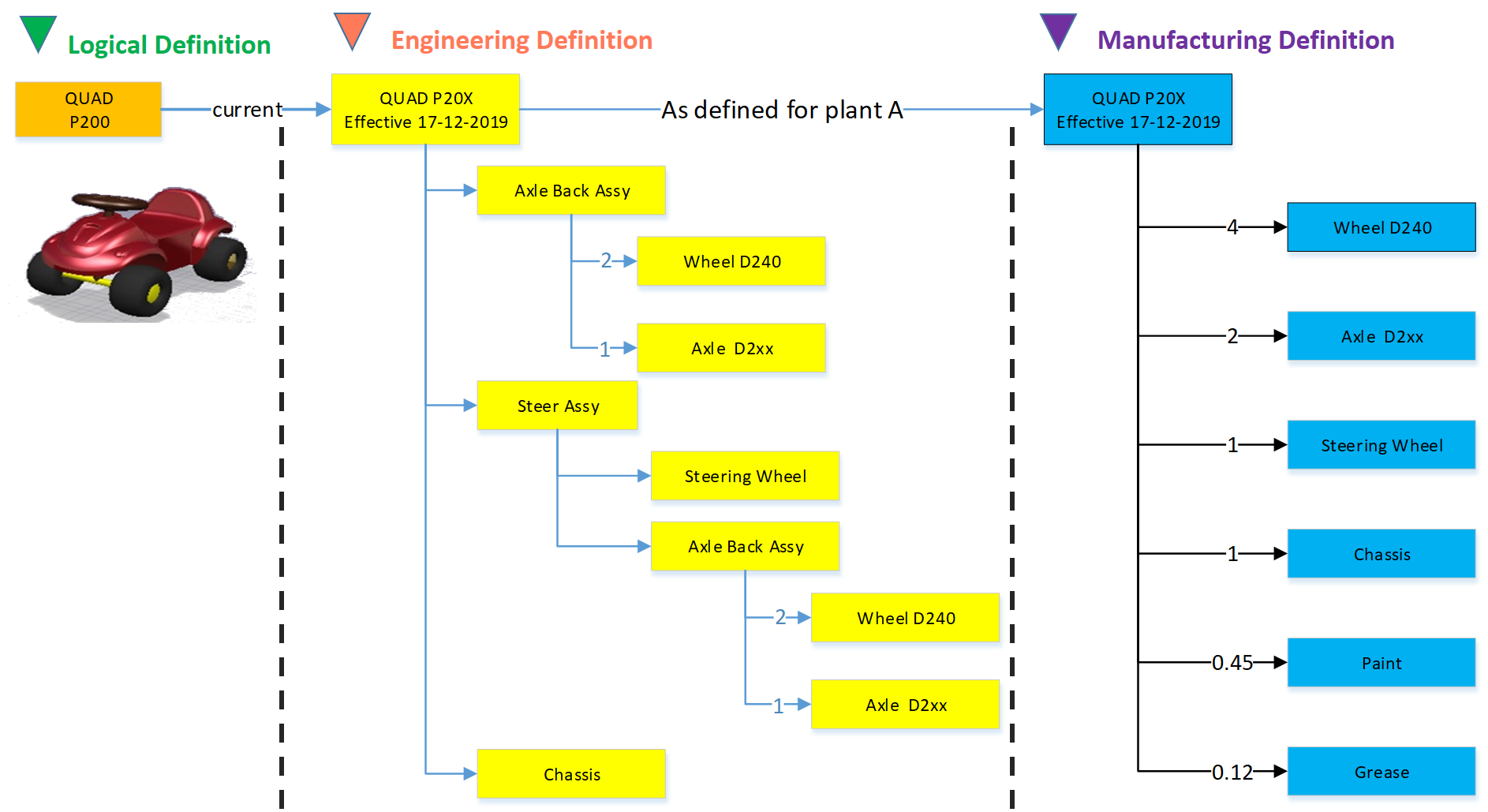 In part five, I introduced the need to have a split between a logical product definition and a technical EBOM definition. The logical product definition is more the system or modular structure to be used when configuring solutions for a customer. The technical EBOM definition is, most of the time, a stable engineering specification independent of how and where the product is manufactured. The manufacturing BOM (the MBOM) should represent how the product will be manufactured, which can vary per location and vary over time. Let us look in some of the essential elements of this data model