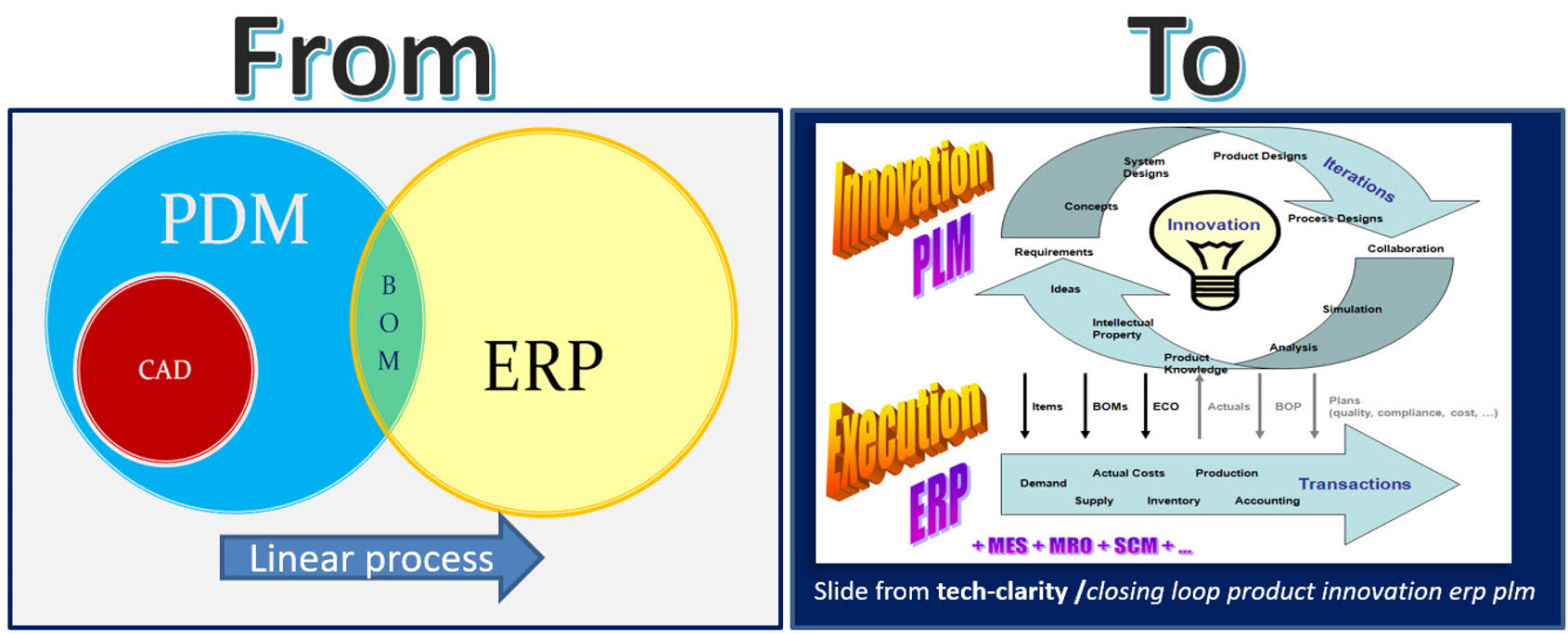 The image on the right describes perfectly the complementary roles of PLM and ERP. The image on the left shows the typical PDM-approach. PDM feeding ERP in a linear process. The image on the right, I believe it is from 2004, shows the best practice before digital transformation. PLM is supporting product innovation in an iterative approach, pushing released information to ERP for execution.