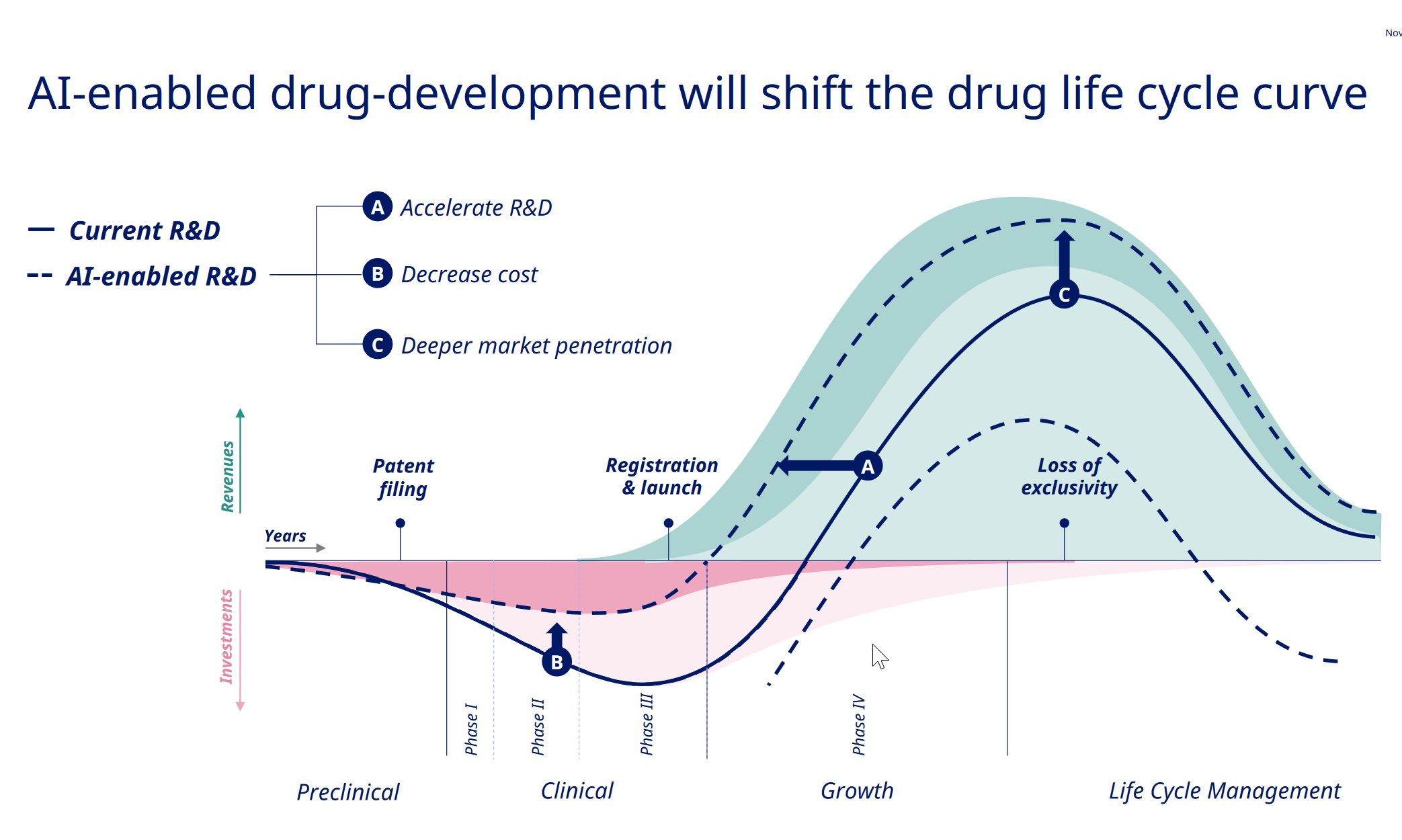 Understanding the potential of AI, they identified 59 areas where AI can create value for the business, and it is interesting to compare the traditional PLM curve Peter shared in his session with the potential AI-enabled drug-development curve as presented by Anders below:
