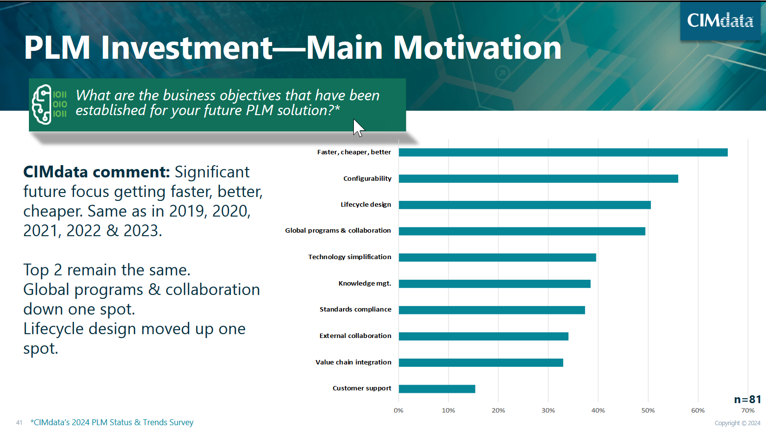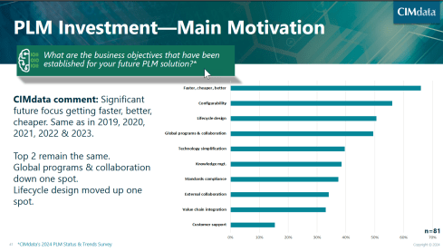 Peter also shared the results of a recent PLM survey where companies were asked about their main motivation for PLM investments. I found the result a little discouraging for several reasons:
