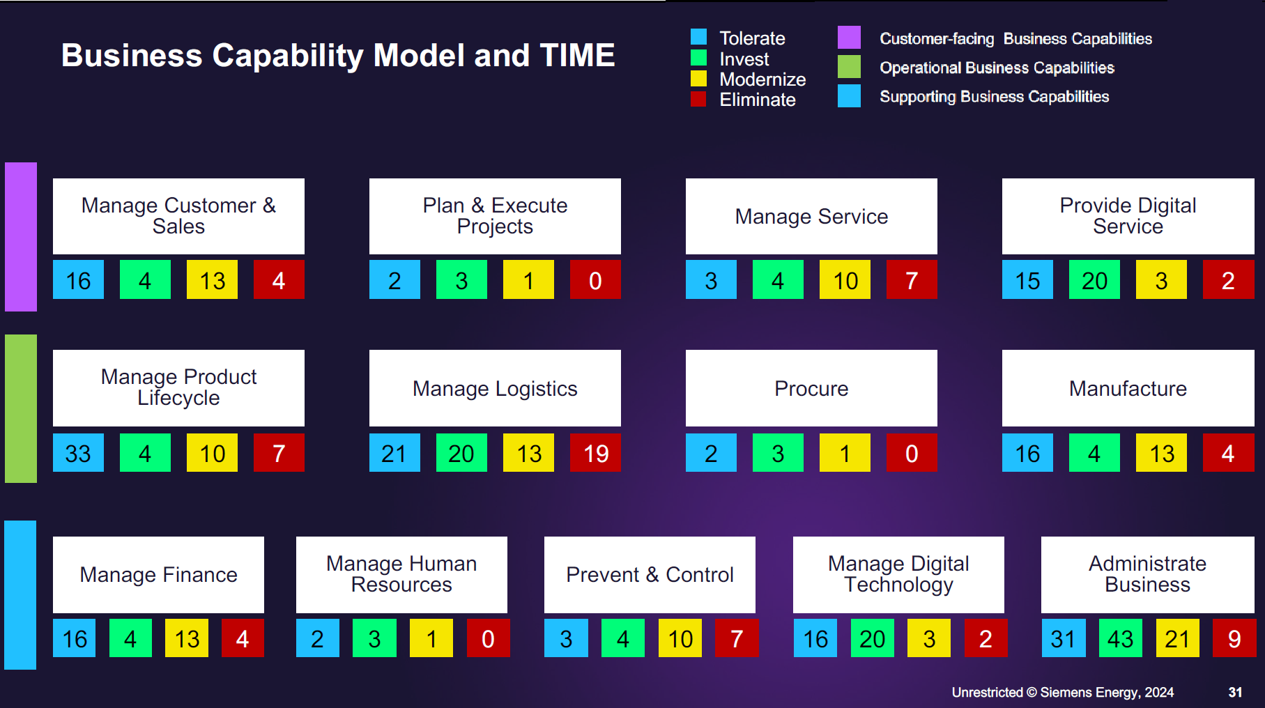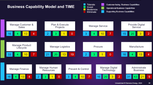 Peter explained how they used Business Capability Modeling when Siemens Energy went through various business stages. First, the carve-out from Siemens AG and later the merger with Siemens Gamesa. Their challenge is to understand which capabilities remain, which are new or overlapping, both during the carve-out and merging process.
