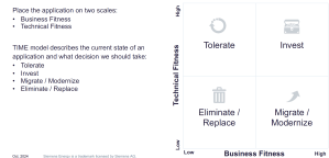 Next, for the lifecycle of the applications, the TIME approach was used, meaning that each application was mapped to business fitness and technical fitness. Click on the diagram to see the details.