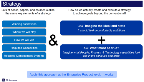 I like his strategy to execution approach, as shown in the image below, as it contains the most important topics. The business vision and understanding, the imagination of the end status and What must be True?