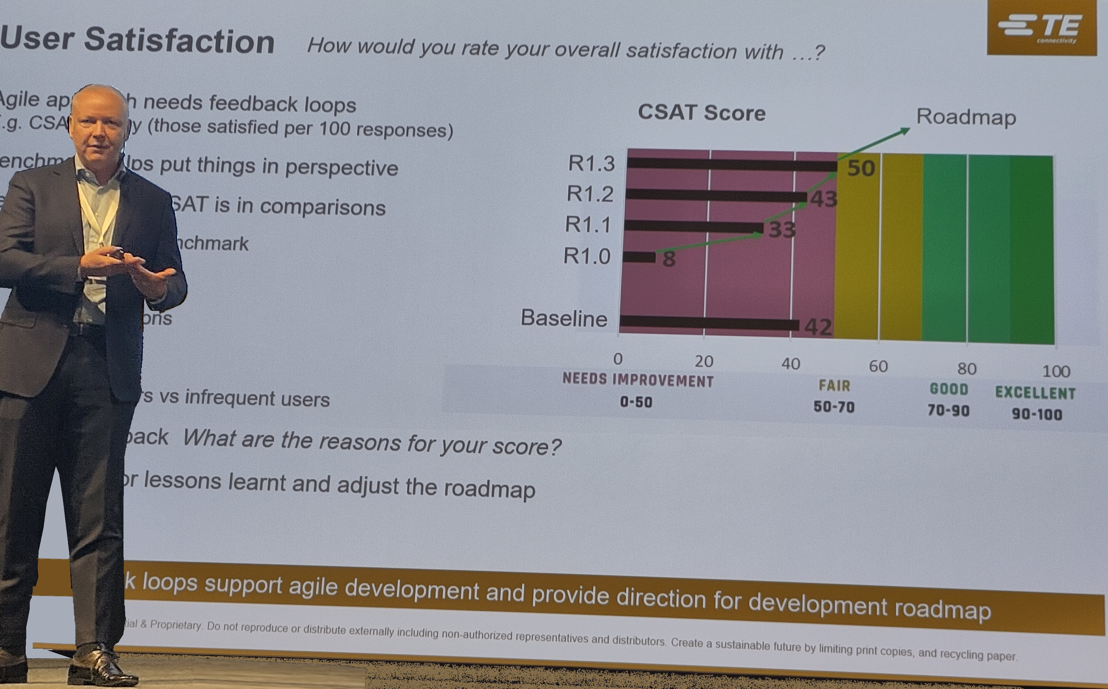 Peter Sandeck, Director of Project Management at TE Connectivity shared what they did to motivate engineers to endorse their Jurisdiction and Classification Assessment (JCA) process. Peter showed how, through a Minimal Viable Product (MVP) approach and listening to the end-users, they reached a higher Customer Satisfaction (CSAT) score after several iterations of the solution developed for the JCA process.