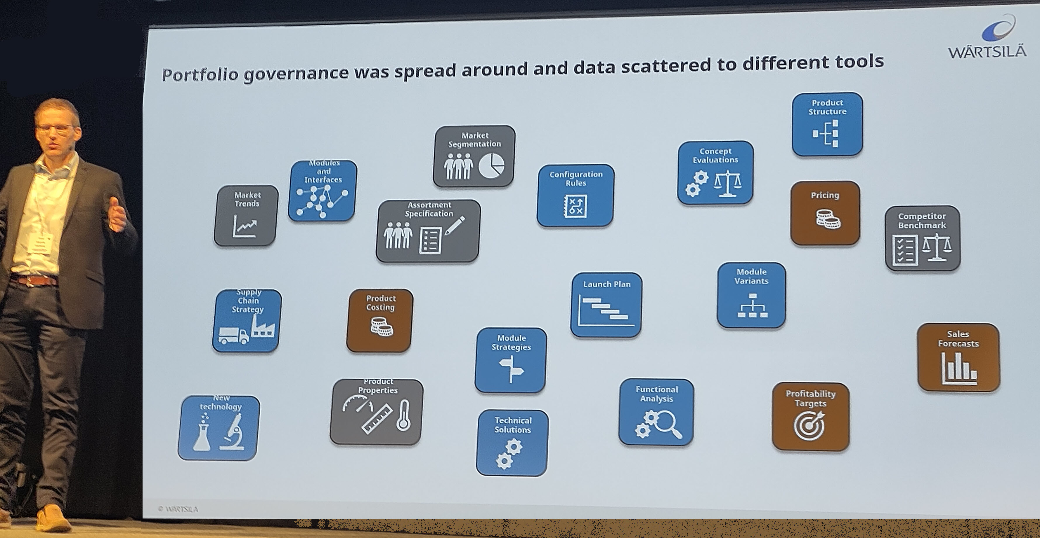 Jussi Sippola, Chief Expert, Product Architecture Management & Modularity at Wärtsilä, presented an excellent story related to the advantages of a more modular product architecture. Where historically, products were delivered based on customer requirements through the order fulfillment process, now there is in parallel the portfolio management process, defining the platform of modules, features and options.