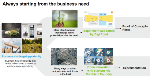 Their Digi Fund process is a fast process to quickly go from idea to concept, to POC and to pilot, the left side of the funnel. After a successful pilot, an implementation process starts small and scales up.