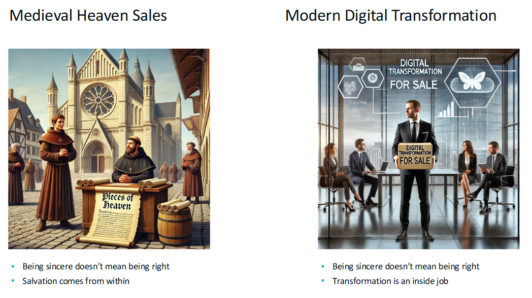 On the left side, we see the medieval Catholic church sincerely selling salvation through indulgences, where the legend says Luther bought the hell, demonstrating salvation comes from inside, not from external activities – read the legend here.