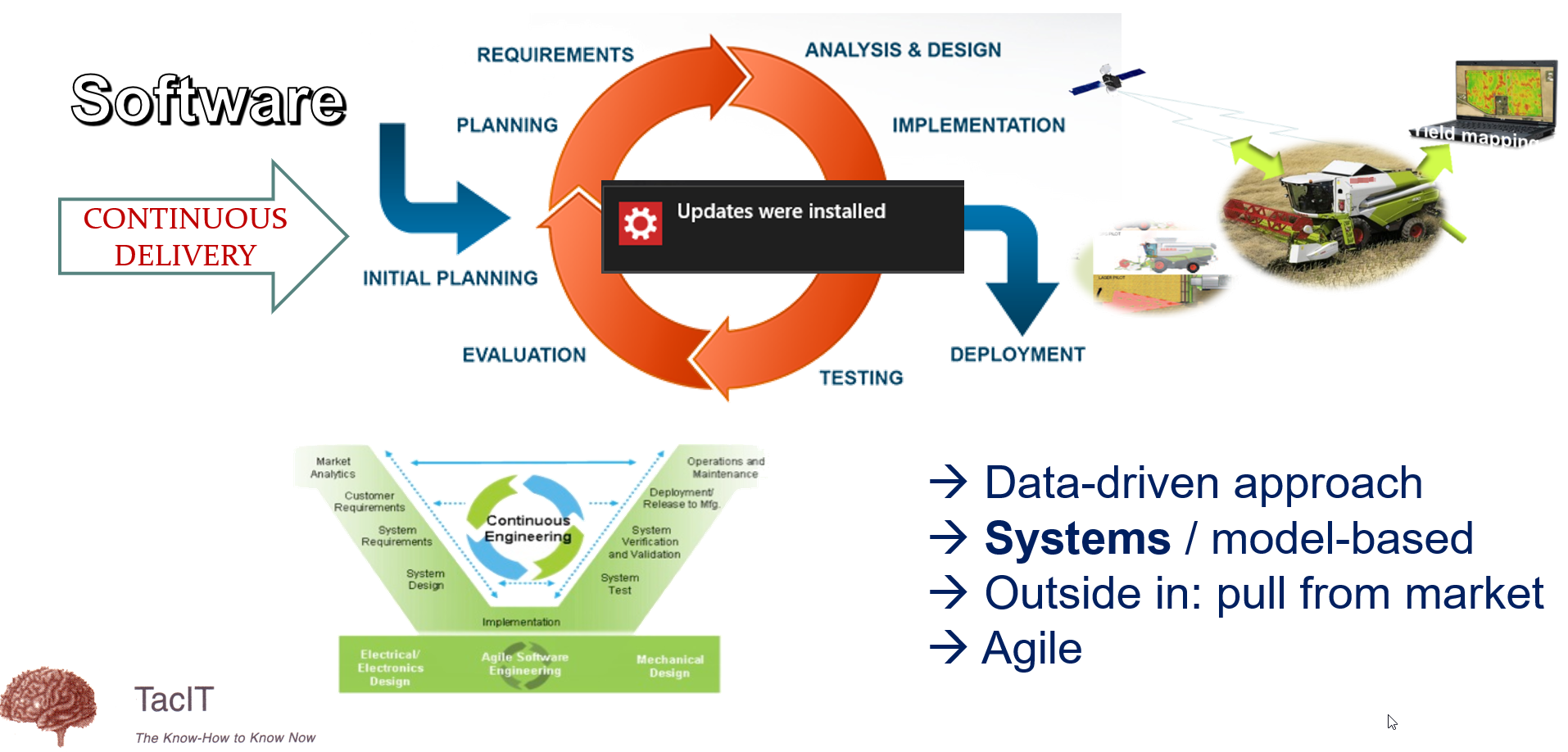The final and most significant upcoming change is the fact that we are entering a complete new era: From linear and predictable towards fast and iterative, meaning that classical ways we push products to the market will become obsolete. The traditional approach was based on lessons learned from mechanical products after the second world-war. Now through globalization and the importance of embedded software in our products, companies need to deliver and adapt products faster than the classical delivery process as their customers have higher expectations and a much larger range to choose from. The result from this global competitiveness is that companies will change from delivering products towards a more-and-more customer related business model (continuous upgrades/services). This requires companies to revisit their business and organization, which will be extremely difficult. Business wise and human change require new IT concepts – platform? / cloud services? / Big data?
